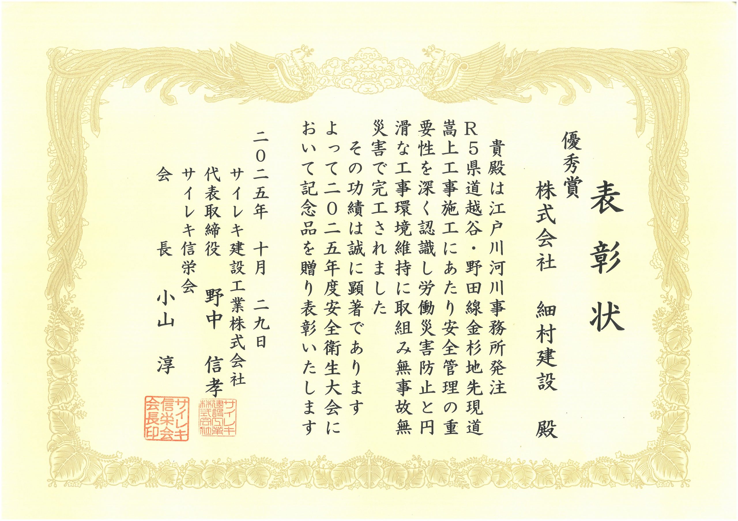 サイレキ建設工業株式会社の安全衛生大会が10月29日に開催され、当社が施工した「R5県道越谷・野田金杉地先現道嵩上工事」が優秀賞を受賞致しました。大変光栄な事であり、今後も安全管理の重要性を深く認識して、円滑な施工と無事故を継続していきます。