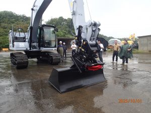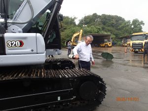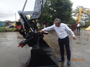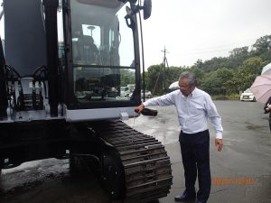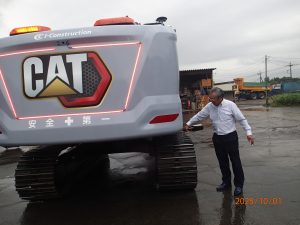10月1日大安にラジコン付、チルトローテーター付のCAT320-07が納車となりました。雨の中でしたが社長にお酒で清めて頂き「安全操業」を祈願。ラジコン付ですので乗車しないで操縦が出来ます。 進んでるー。 今回の購入のCAT320はチルトローテーターが付いていますので、バケットの着脱が簡単!バケットは360度自由自在!法面成形も傾けて成形! CAT100周年記念仕様のロゴとカラーで超カッコイイ!